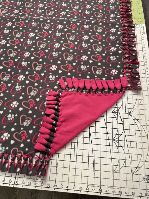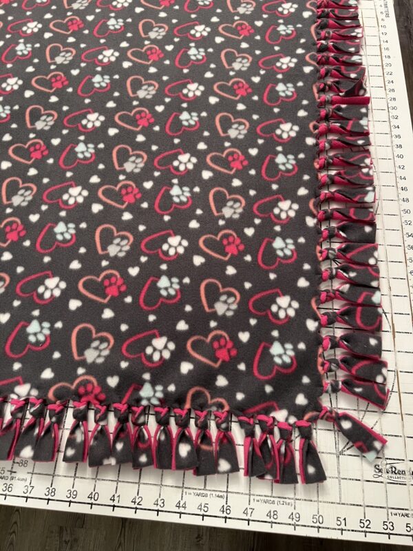 Pink And Gray Paws & Hearts Handmade Double Thick Fleece Tie Blanket is made with Pink And Gray Paws fleece fabric on the front and high quality pink fleece on the back. It is the perfect gift for your fur baby. It measures 54″ long by 52″ wide (change for different sizes)