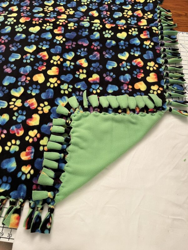 Tie Dye Paw Prints Handmade Double Thick Fleece Tie Blanket is made with Tie Dye Paw Prints Fleece Fabric on the front and high quality green fleece fabric on the back. This is the perfect gift for your fur baby. It measures 54″ long x 52″ wide (change this portion for each size)